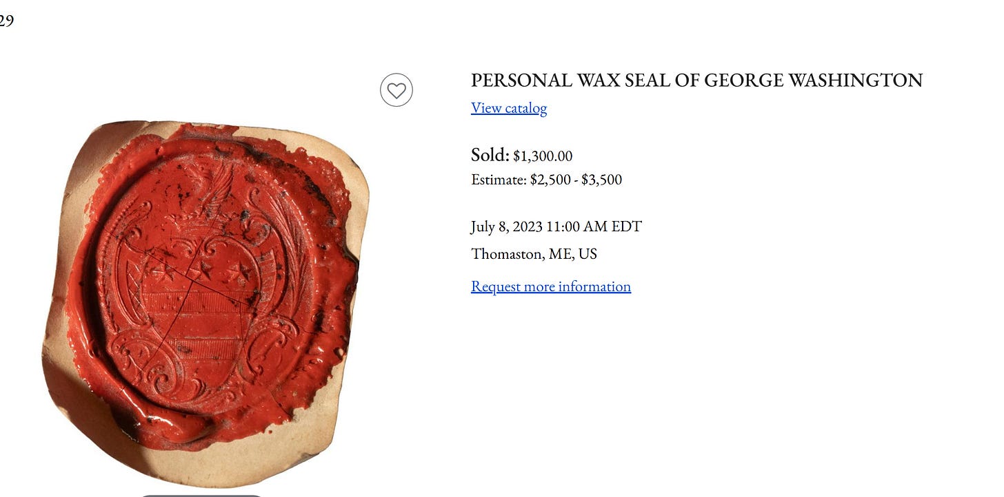 George Washington’s personal wax seal featured his family’s coat of arms, consisting of a shield with two horizontal bars and three five-pointed stars (mullets). It was often used to secure private letters, sometimes topped with a crest of a raven rising from a coronet. The seal was commonly set in a gold watch fob.