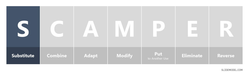 SCAMPER consists of seven steps. These steps can be used to aid learning, brainstorming, and finding solutions by what can be called a change of perspective to aid unconventional thinking. The seven steps of scamper can be a guide for people looking to use the technique for thinking outside the box for discovering new ways of doing things. Be it to find more efficient processes, aid students and trainees to learn new concepts with a mature outlook or explore ideas.